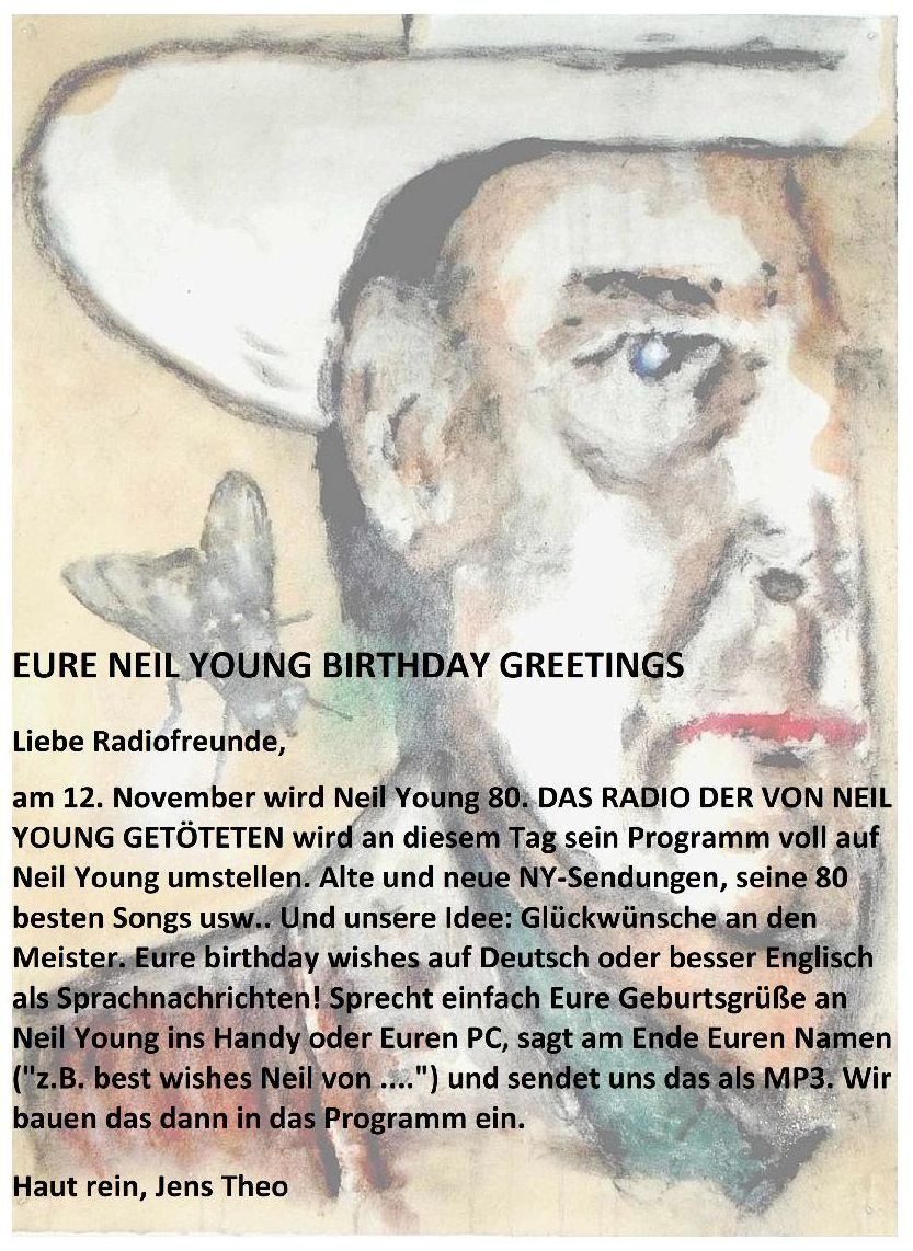 am 12. November wird Neil Young 80. DAS RADIO DER VON NEIL YOUNG GETÖTETEN wird an diesem Tag sein Programm voll auf Neil Young umstellen. Alte und neue NY-Sendungen, seine 80 besten Songs usw..